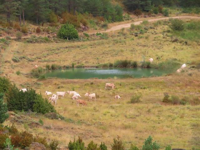 A mi derecha y abajo veo ahora la pista por la que de no haber cogido el atajo hubiéramos caminado. También una balsa de agua junto a la que se reúnen unas cuantas vacas. La zona está vallada, lo que me hace pensar que tanto el ganado como la balsa pertenecen al Corral de Pistolas.