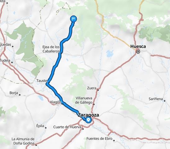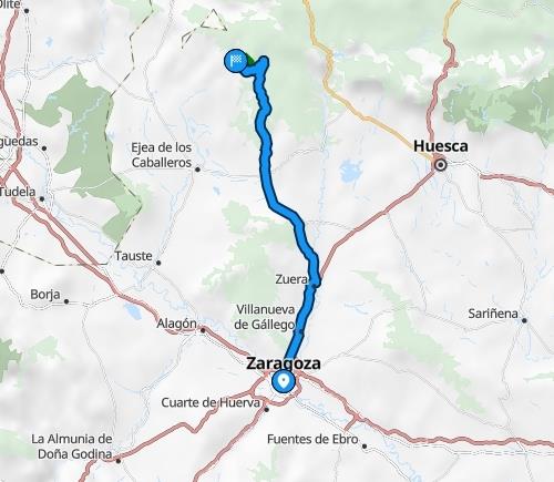 Como podéis ver tanto por una ruta como por la otra la distancia y el tiempo son similares. Yo he escogido la de Zuera porque la carretera es mucho más bonita en cuanto al paisaje, ya que se cruzan extensas zonas de bosque, aunque eso sí, tiene muchas más curvas, y si no te gustan para conducir, mejor la primera opción.