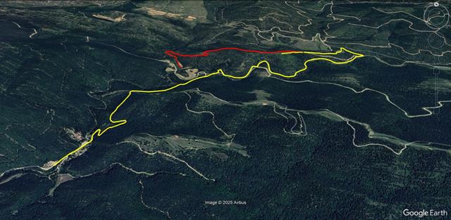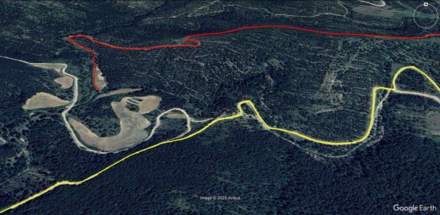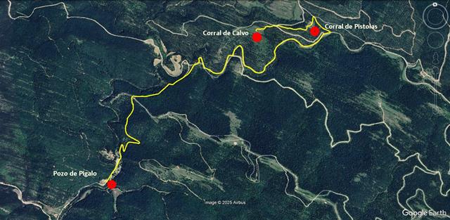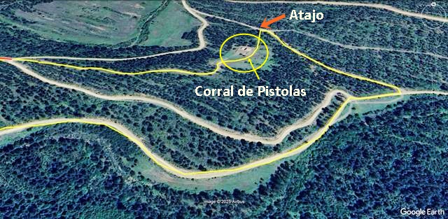 Son las 12:20 horas. Tenemos intención de volver por la pista pero nos damos cuenta de que quizás no hace falta regresar exactamente por el Corral de Pistolas ni por el atajo. Otro ramal parece que desciende desde el Corral de Calvo y sospecho desembocará en la pista por la que caminamos hace unas horas. Lo tomamos y efectivamente, en esta ocasión hemos acertado, tras unos 600 metros, salimos a la pista. (en naranja en la foto de debajo).