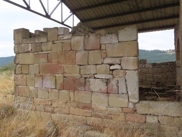 Y en el horizonte medio, con el zoom de mi agradecida cámara canon compacta ,alcanzo a ver el tejadillo que cubre la zona del Corral de Calvo y que protege lo que hemos venido a ver,un interesante asentamiento prerrománico ubicado a los pies de la sierra de Santo Domingo y en la cabecera del río Arba de Luesia.