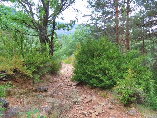 Es el típico camino de montaña que desciende de forma mucho más pronunciada que la pista, el firme es relativamente bueno, vamos bajando entre bojes y pinos.