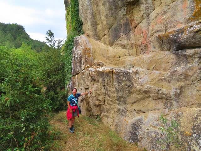 Una vez ya en la base de la enorme roca que sustenta las torres, mi amiga Mónica descubre un senderillo que internándose en la vegetación que rodea el conjunto, igual nos permite descubrir algo más. Nos adentramos por él.