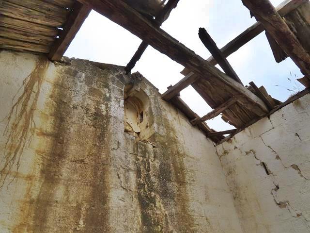 Es una lástima pero la ermita está en un estado lamentable, ruinoso, con grietas, derrumbes, sin techumbre y parece ser que ha sufrido también varios expolios, como el robo de la pila bautismal.